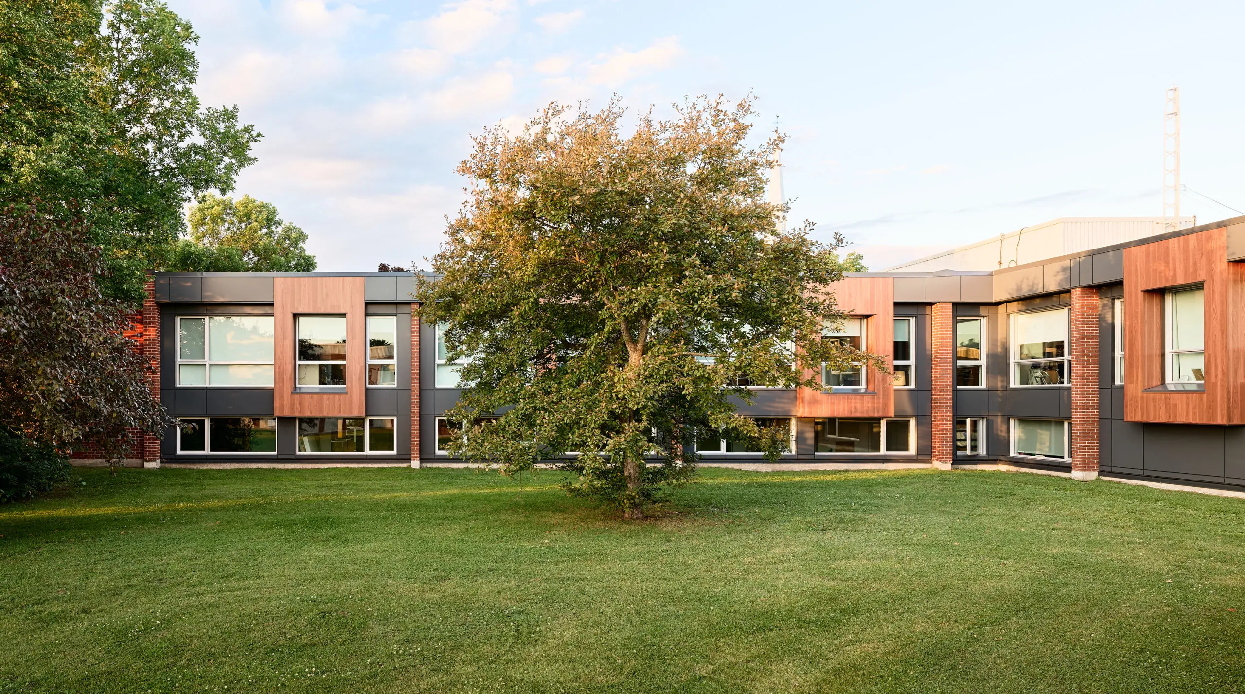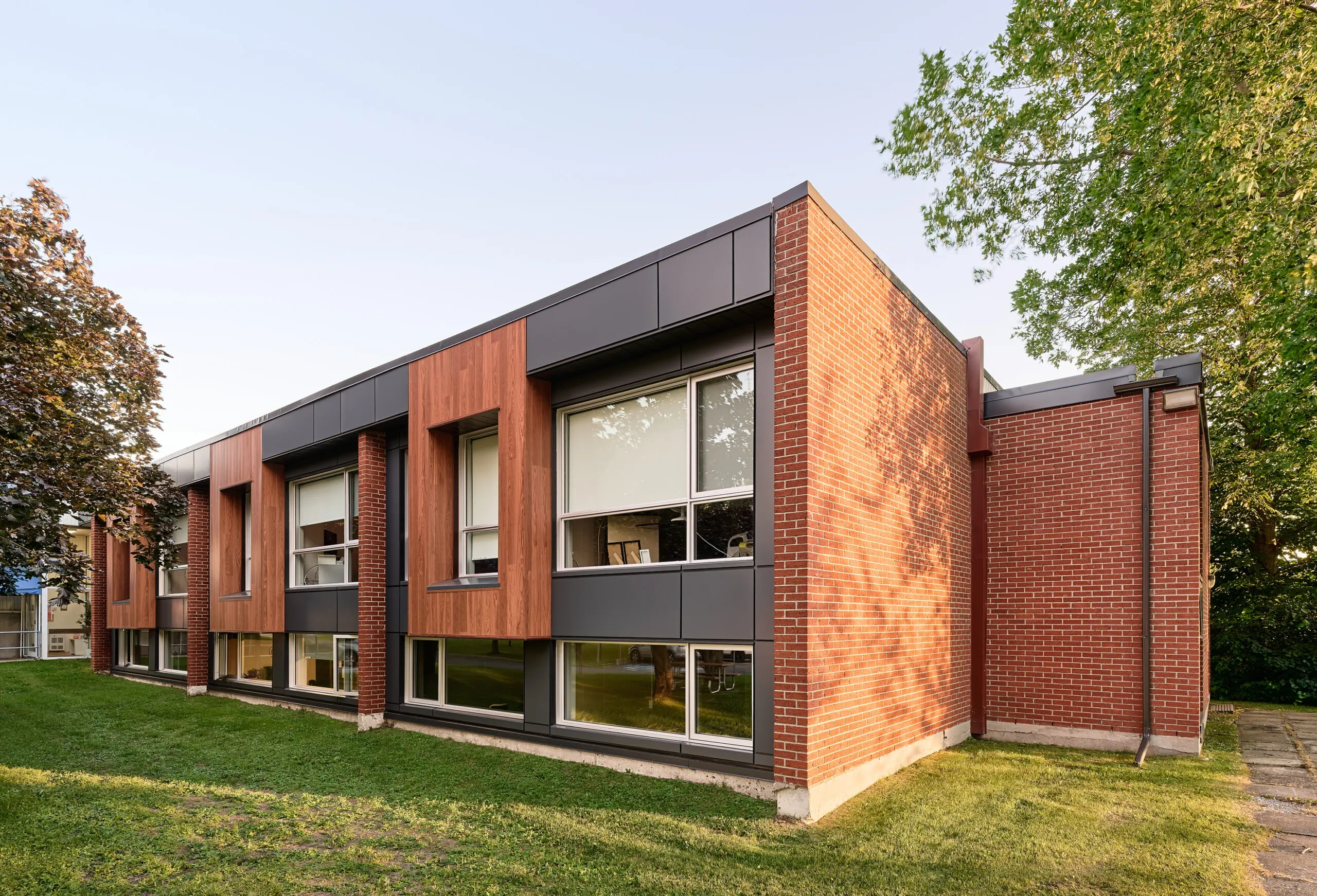 L'objectif initial du projet était le remplacement des fenêtres, mais étant donné que celles-ci étaient fabriquées comme des murs-rideaux en bois couvrant toute la surface d'un axe à l'autre, nous avons dû repenser le projet et prévoir de nouveaux murs extérieurs en y intégrant les nouvelles fenêtres. Le concept du projet était d'apporter une touche plus moderne à la plus vieille partie du CHSLD, tout en mariant les nouveaux matériaux avec la brique existante conservée.Et finalement, comme ces travaux majeurs demandaient que les chambres soient libérées, nous en avons profité pour faire une mise à niveau du niveau des planchers, des murs, des plafonds et des salles de toilettes.