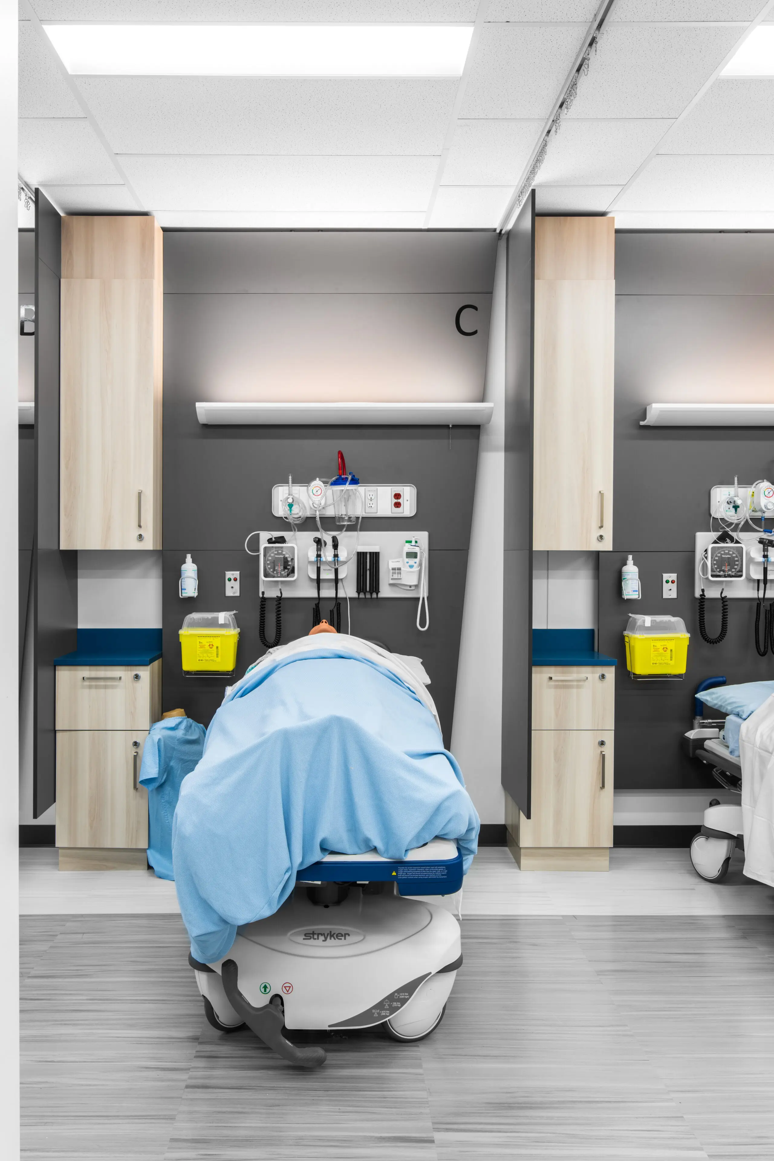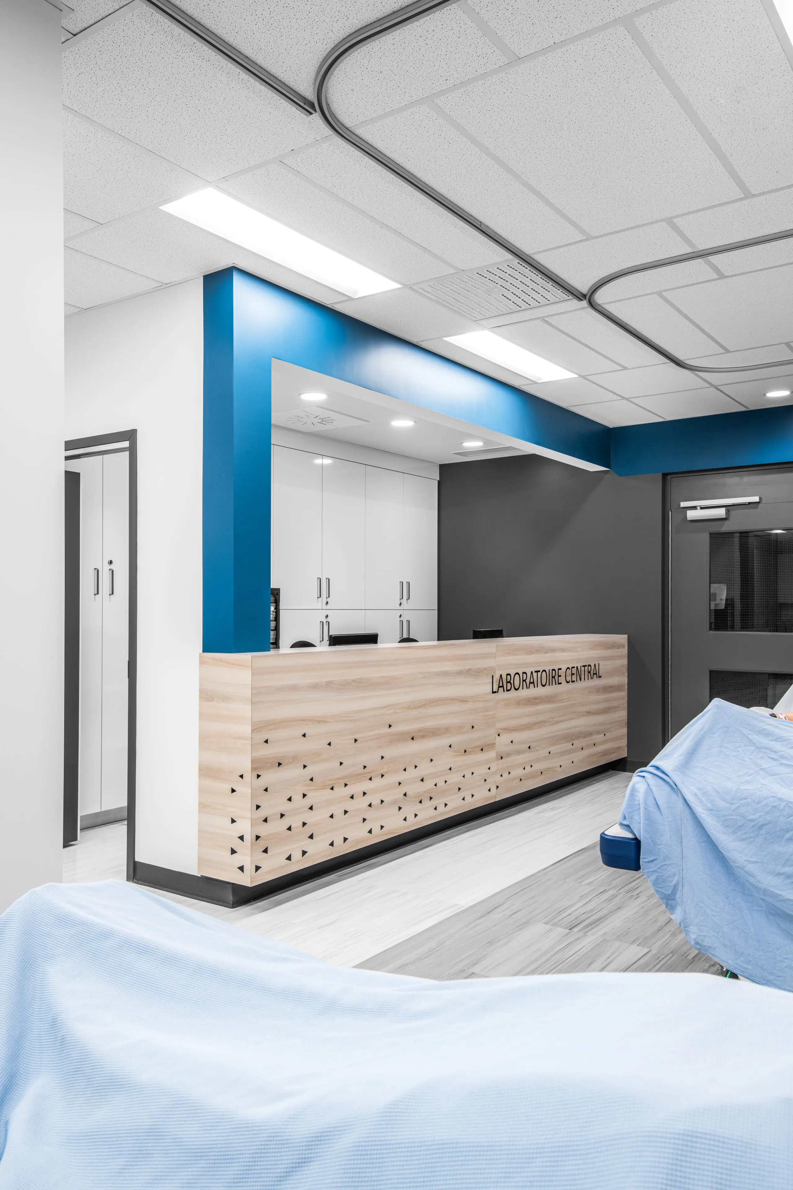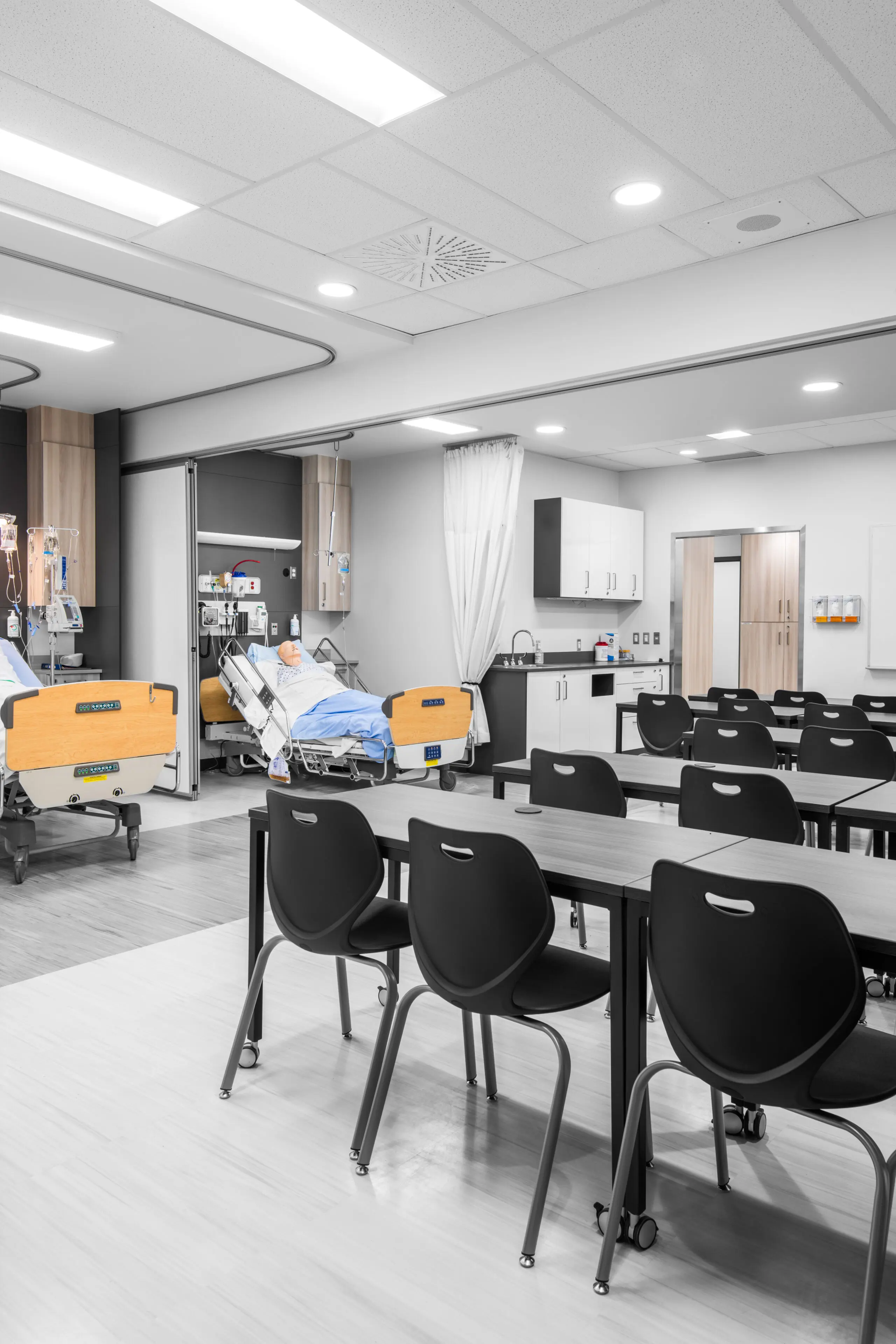 Le projet avait pour but le réaménagement du département des soins infirmiers, en plus d’une réfection des finis et l’élaboration d’une signalétique distinctive dans le cégep. De nouveaux locaux fonctionnels et conformes à la pratique ont été intégrés : un nouveau poste de garde offrant transparence et confidentialité ; un laboratoire central à aire ouverte comprenant 5 lits, rangement intégré et îlots de travail ; deux classes flexibles comprenant chacune une cloison amovible et deux lits pour favoriser l’enseignement appliqué en groupes réduits ; deux locaux d’immersion clinique avec mannequins haute-fidélité, adjacents à une salle de contrôle pour les mises en situation.