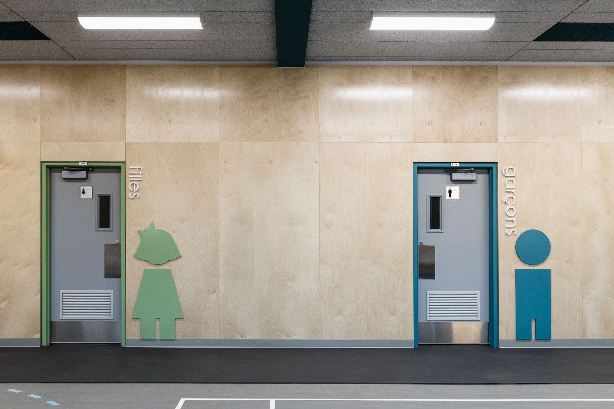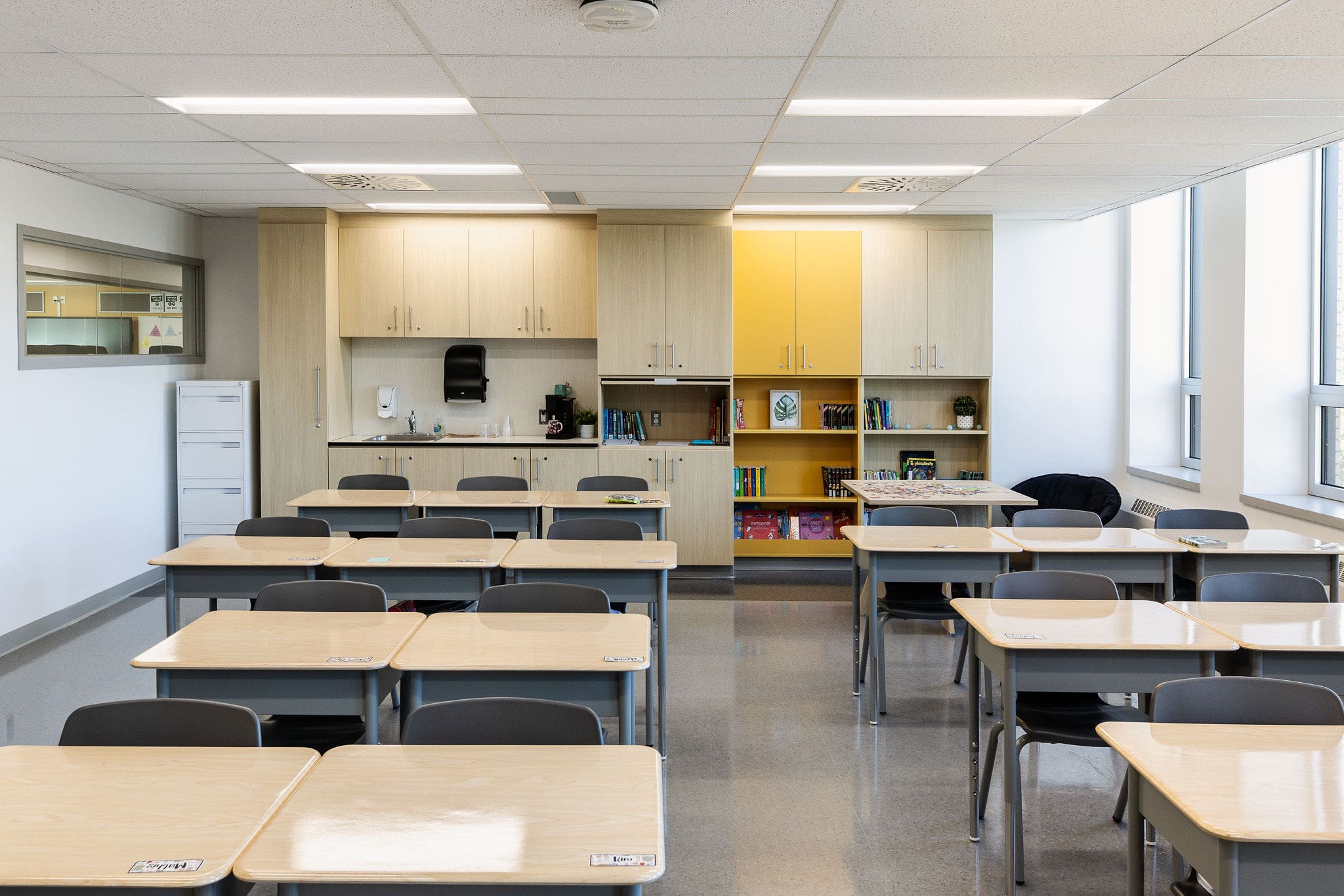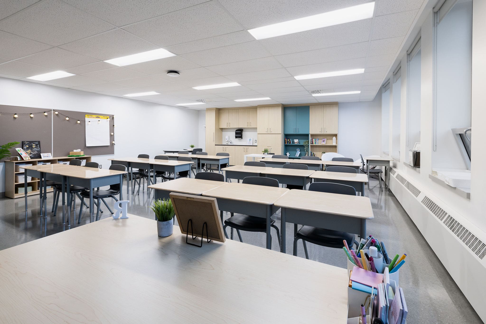 Le projet consistait en un réaménagement complet de 960 m² répartis sur trois étages, visant à transformer un secteur administratif et de formation en une école primaire moderne, annexée à l’établissement St-Albert-le-Grand. L’objectif principal était de maximiser la capacité d’accueil en salles de classe. Le concept retenu propose ainsi 9 classes lumineuses, une classe de musique, une petite bibliothèque, un mini-gymnase, un secrétariat, une salle du personnel enseignant, des bureaux de professionnels ainsi que des vestiaires et sanitaires à chaque étage. Comme le bâtiment avait déjà fait l’objet de rénovations en 2019, une attention particulière a été portée à la conservation et à la réutilisation des finis et équipements en bon état. Le résultat : des espaces scolaires adaptés, fonctionnels et durables, pensés pour accompagner la communauté éducative dans le temps.