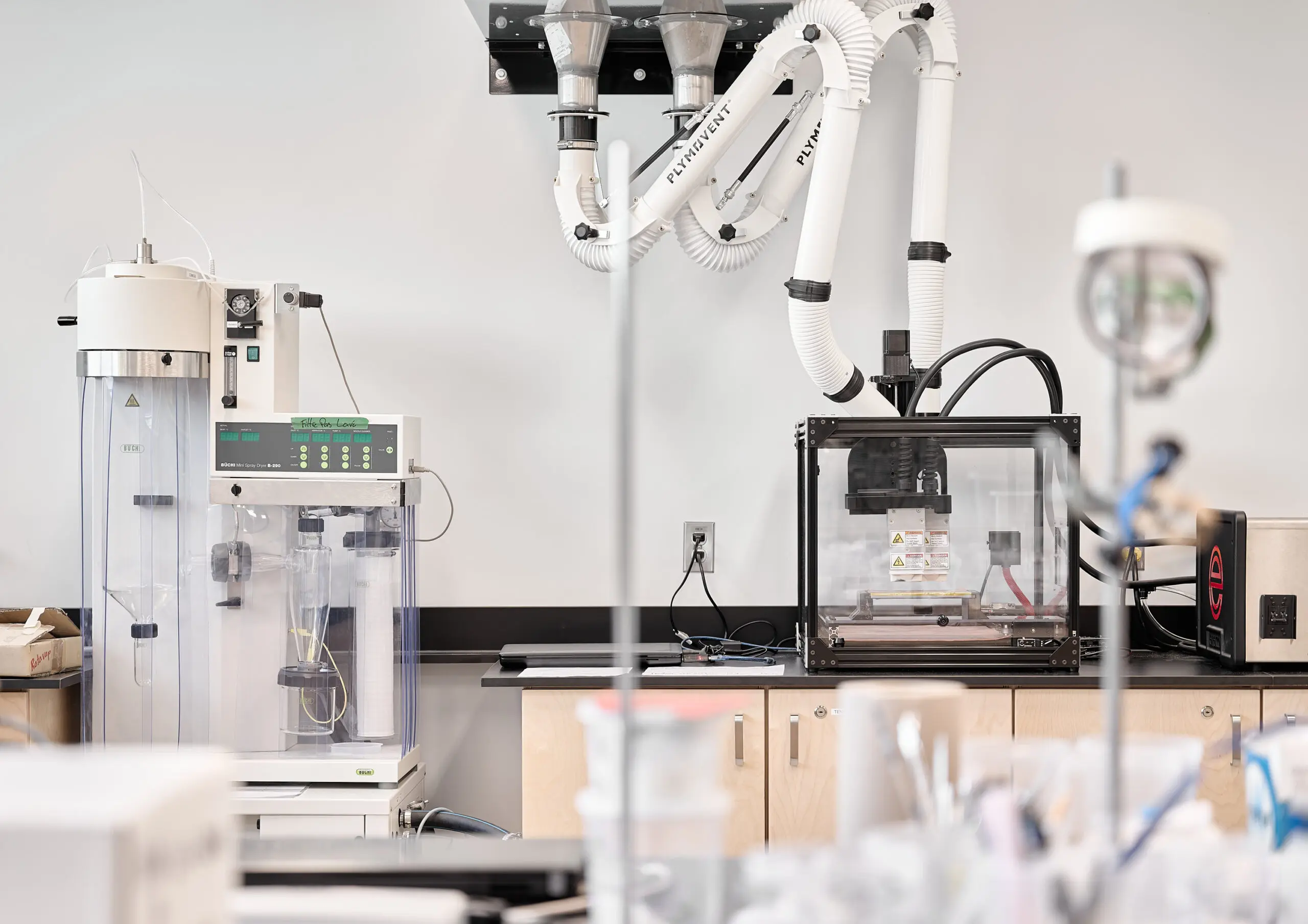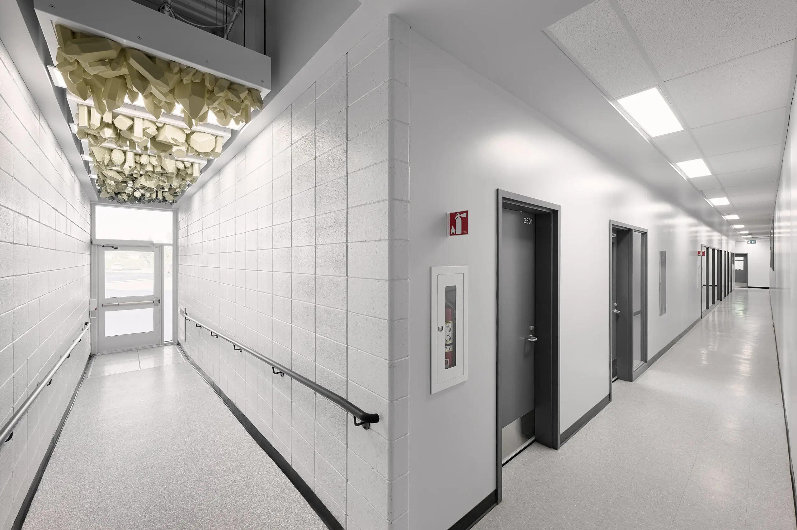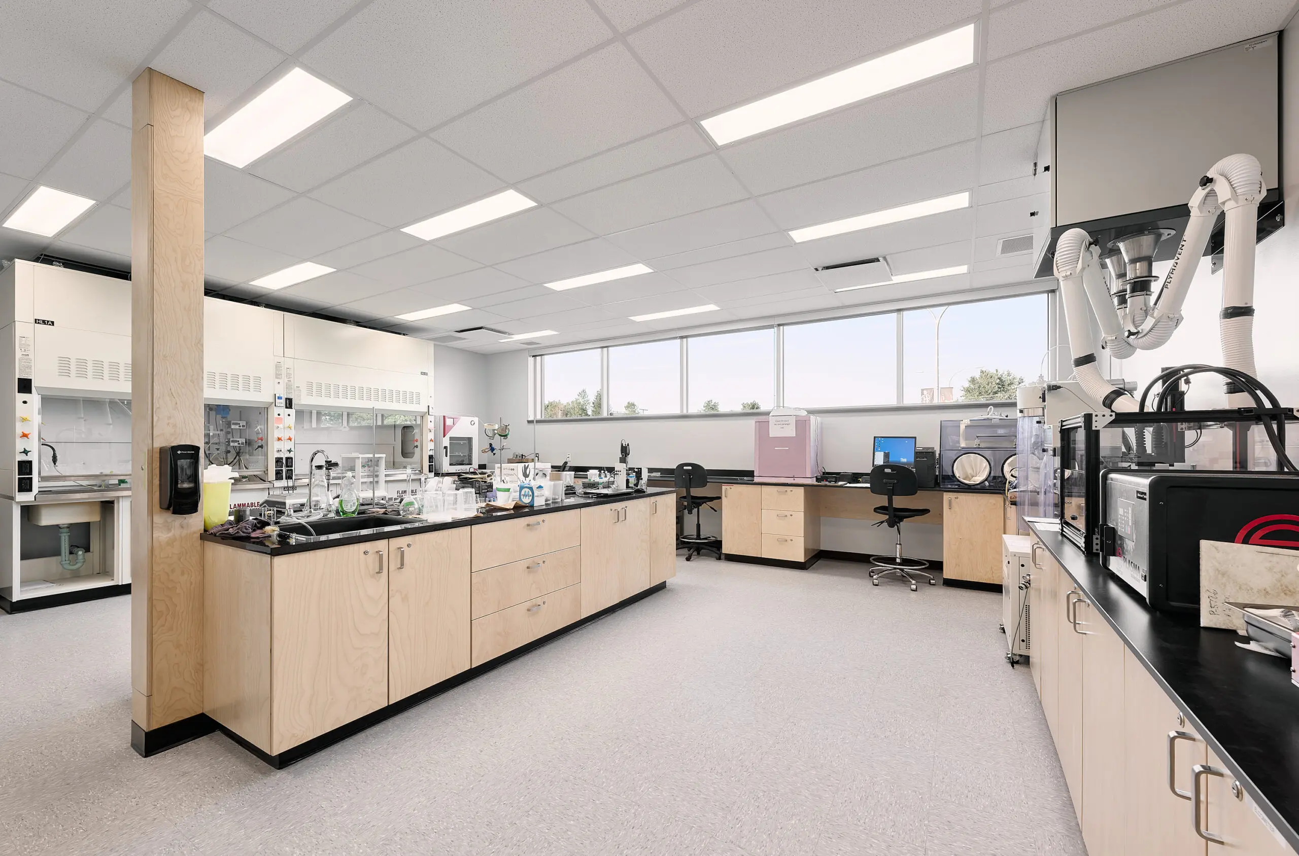 Agrandissement de 500m2 et réaménagement du bâtiment existant pour l’ajout de salle de rencontre et de nouveaux laboratoires consacrés au développement de matériaux de procédés de métallurgie extractive et à la caractérisation de substances minérales ou polymères.