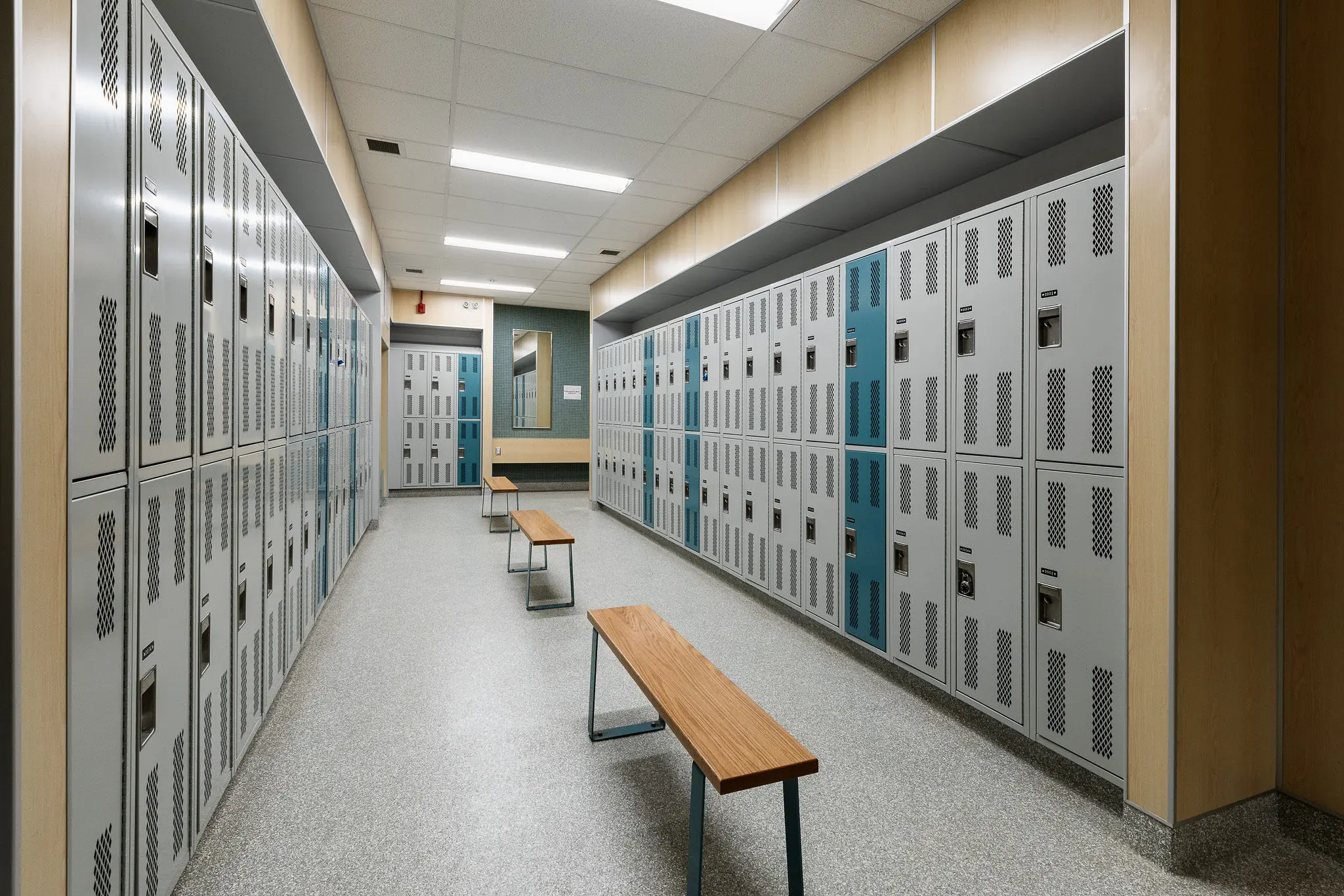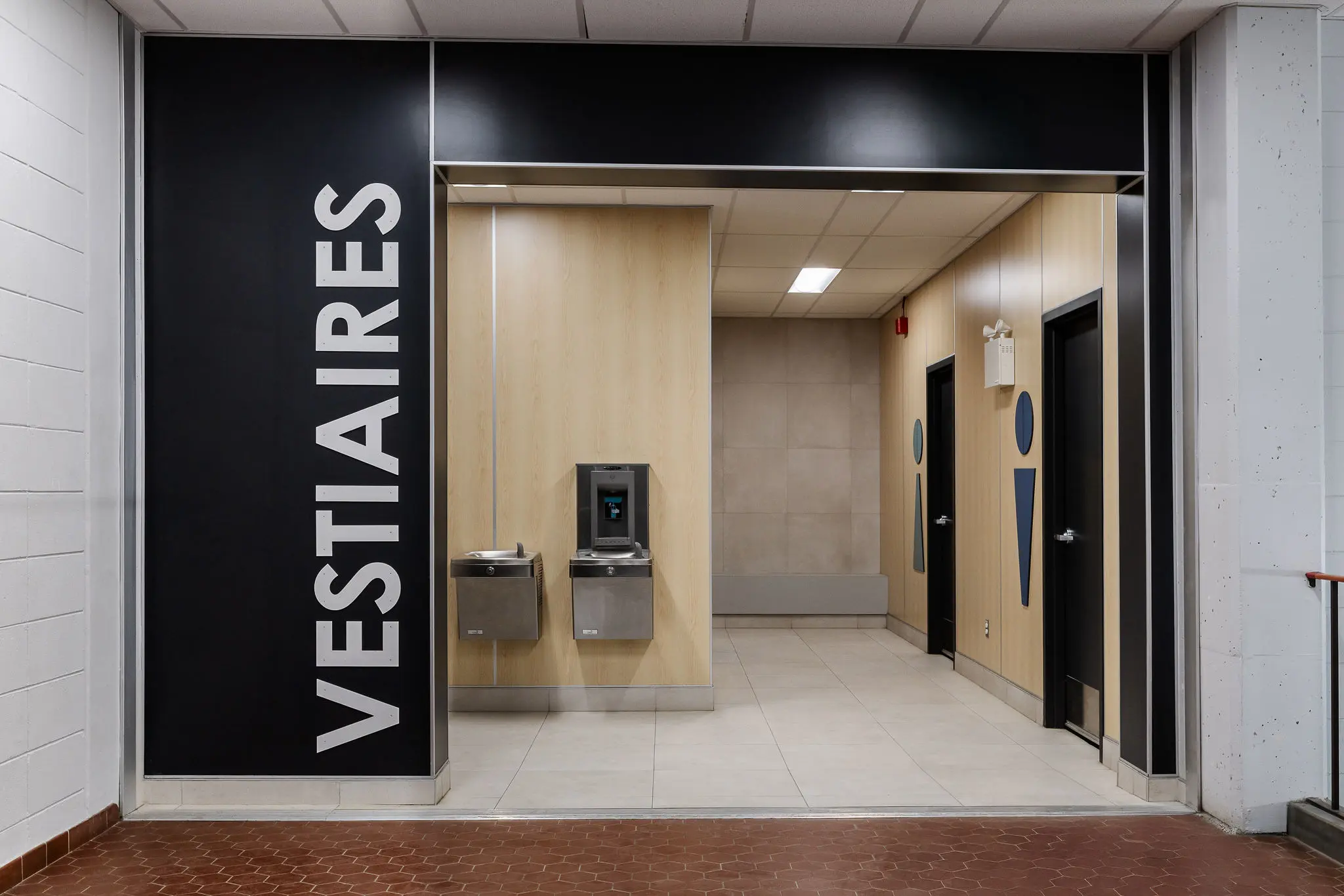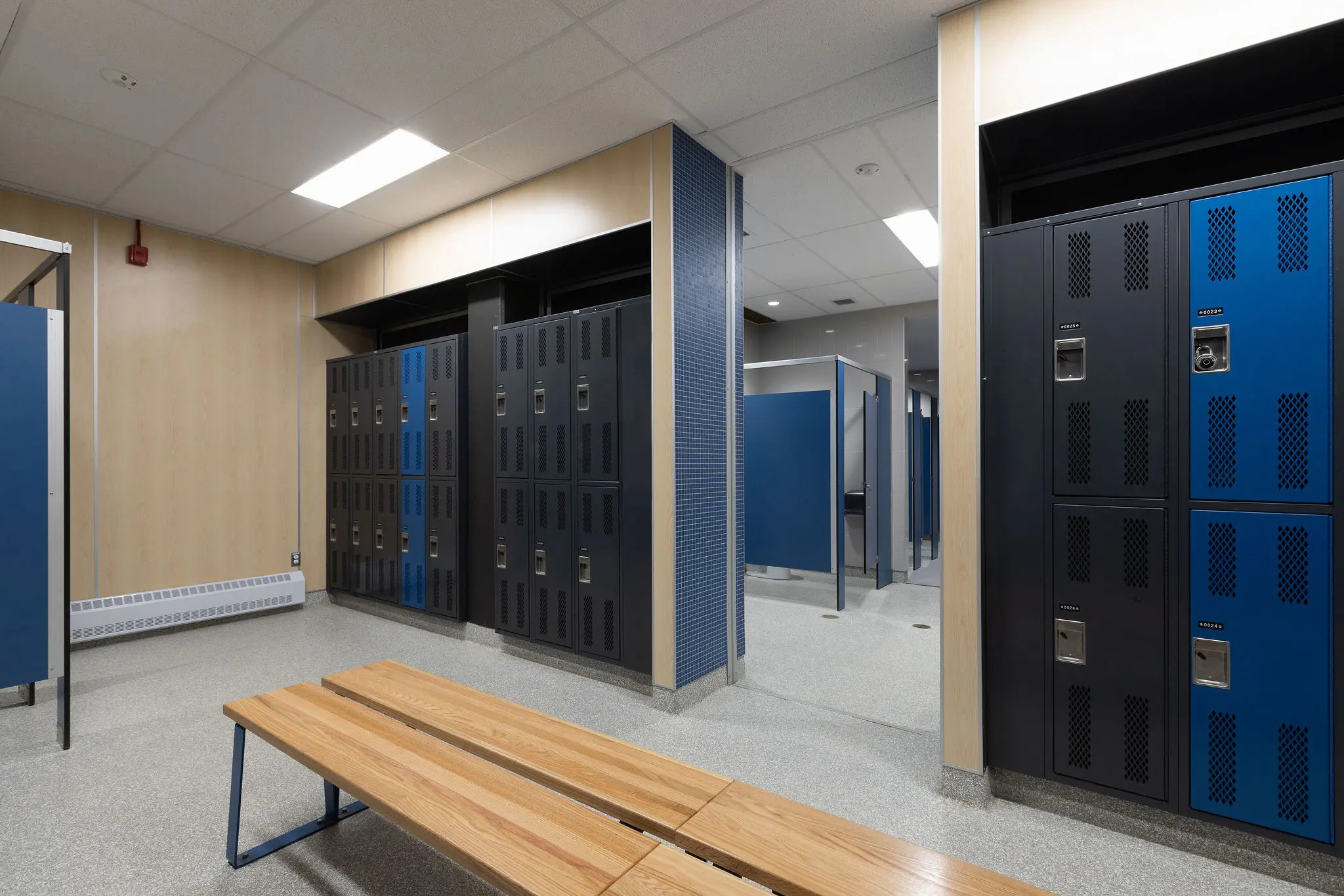 Le mandat consistait à concevoir et aménager de nouveaux vestiaires pour le gymnase, adaptés aux besoins du nouveau palier sportif de l’école. Offrant des installations complètes — douches, toilettes et casiers métalliques doubles — l’espace a été entièrement repensé pour allier fonctionnalité, confort et durabilité. Les finis intérieurs ont été soigneusement sélectionnés, privilégiant des matériaux de qualité tels que la céramique, l’époxy et les protections murales en stratifié, afin d’assurer à la fois une grande résistance et une esthétique contemporaine.