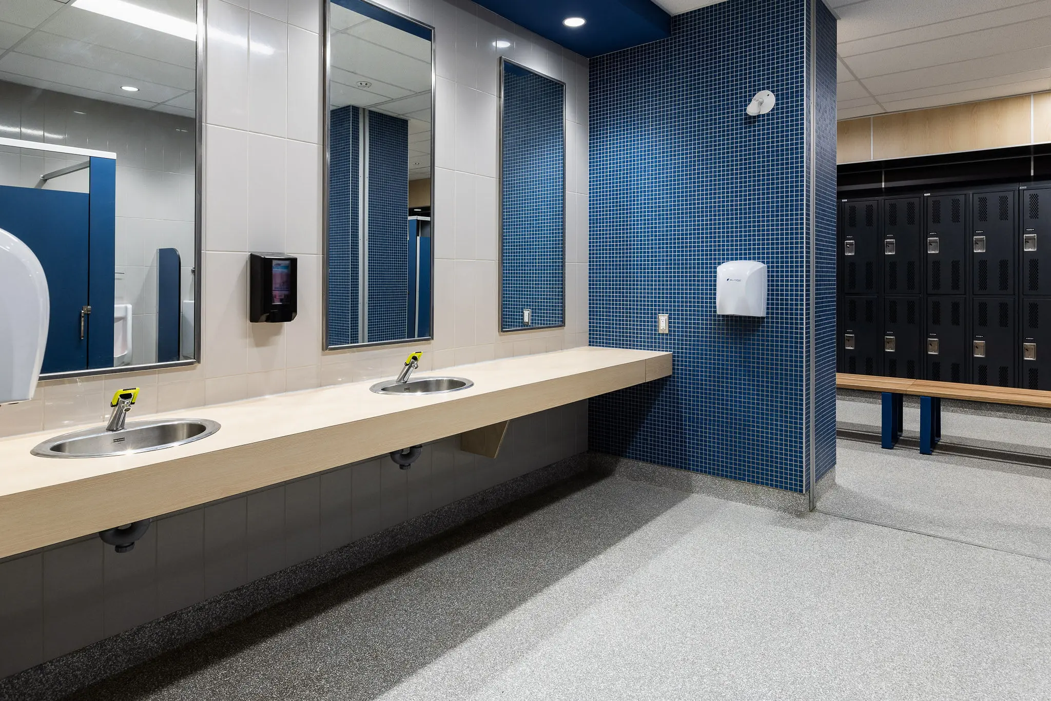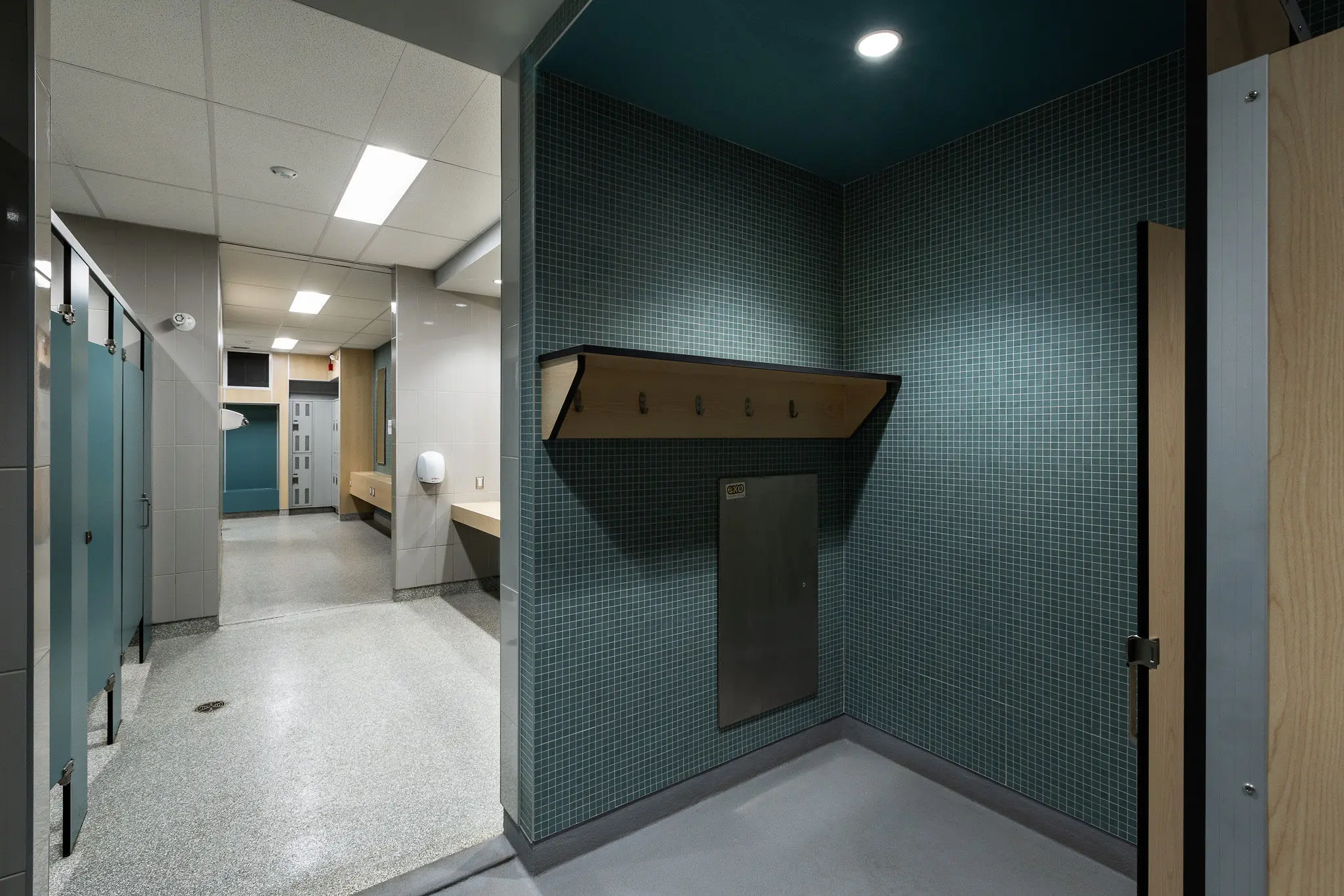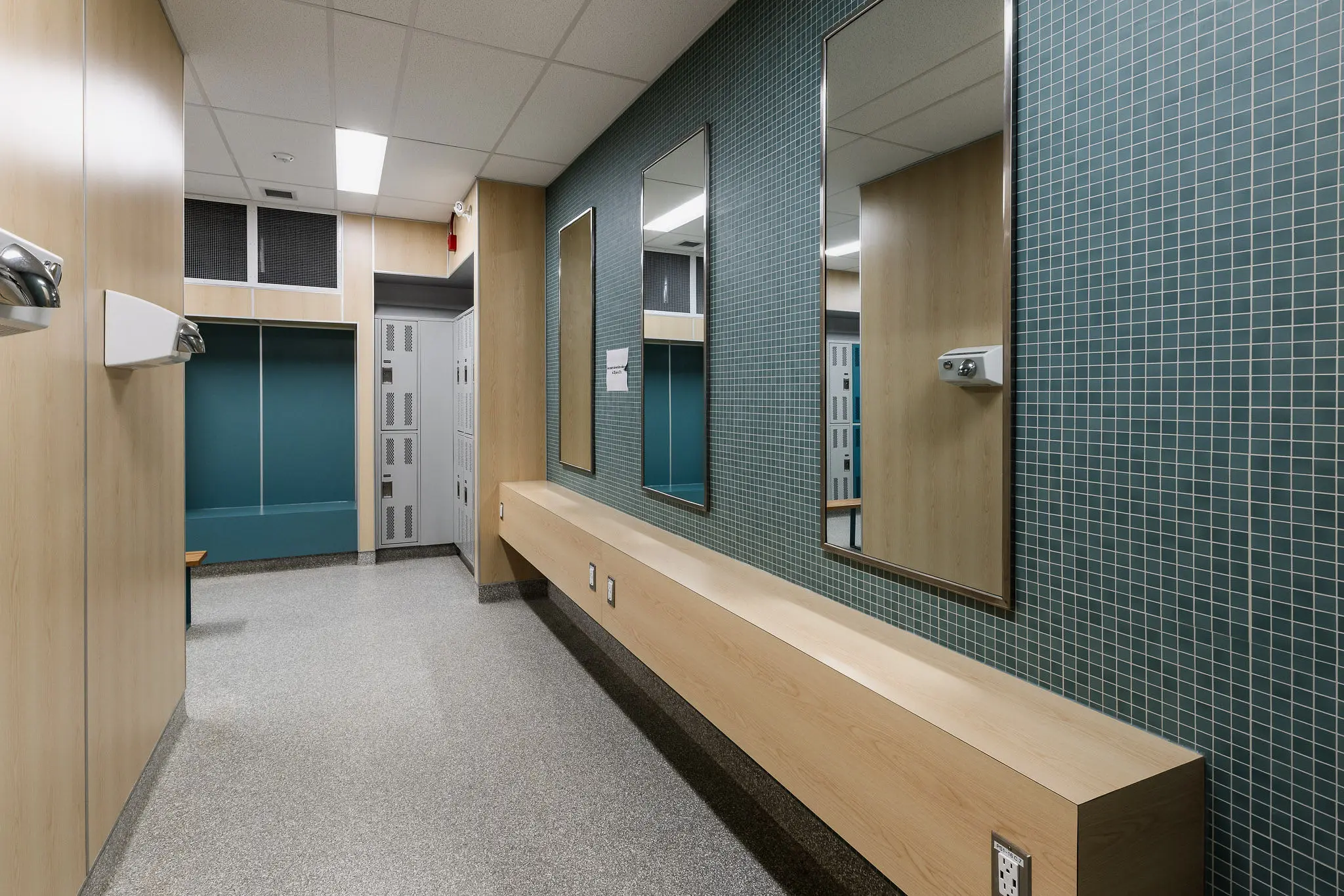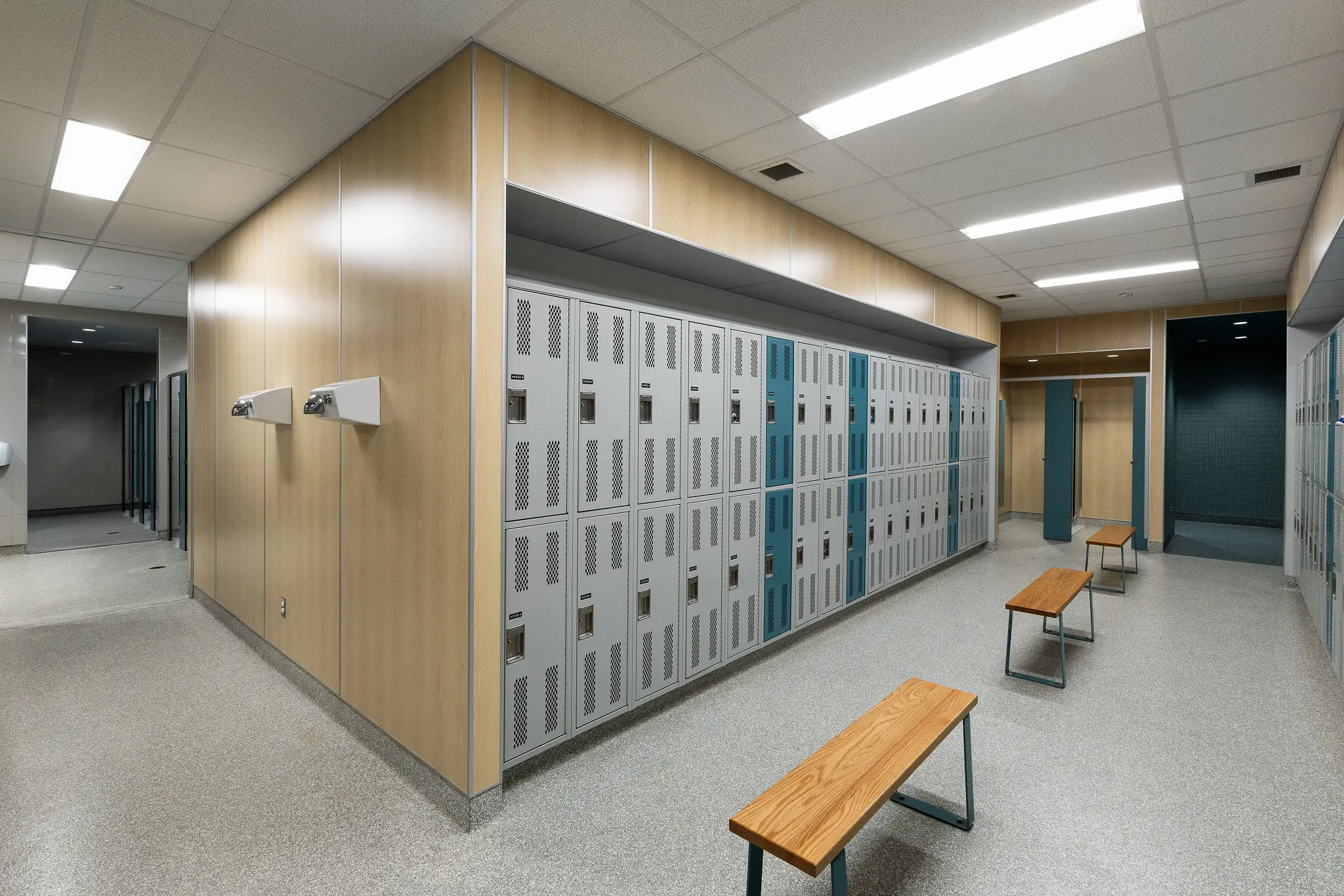 Le mandat consistait à concevoir et aménager de nouveaux vestiaires pour le gymnase, adaptés aux besoins du nouveau palier sportif de l’école. Offrant des installations complètes — douches, toilettes et casiers métalliques doubles — l’espace a été entièrement repensé pour allier fonctionnalité, confort et durabilité. Les finis intérieurs ont été soigneusement sélectionnés, privilégiant des matériaux de qualité tels que la céramique, l’époxy et les protections murales en stratifié, afin d’assurer à la fois une grande résistance et une esthétique contemporaine.