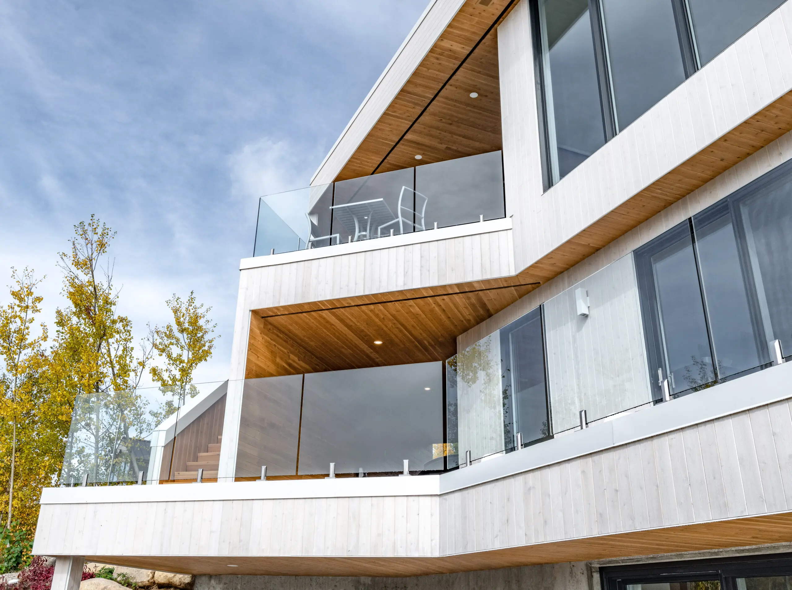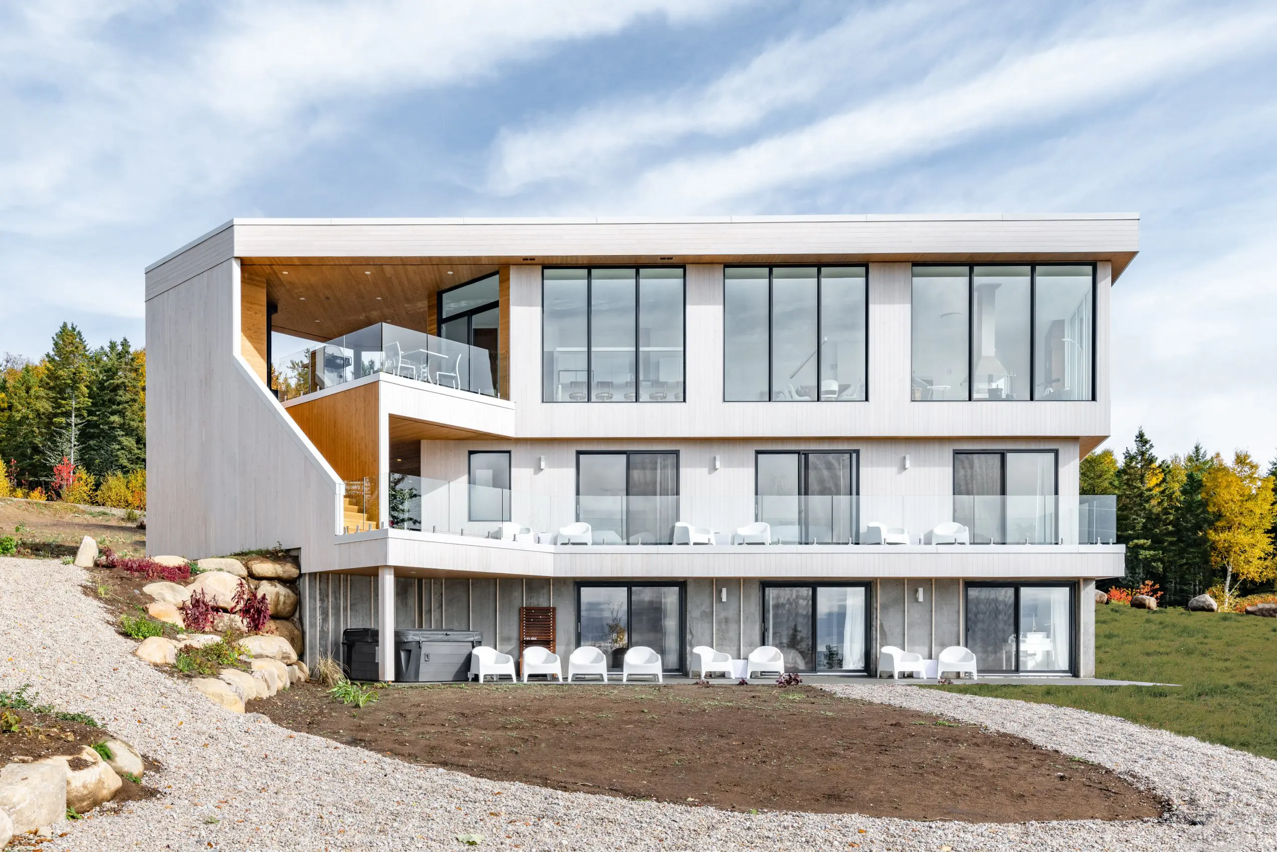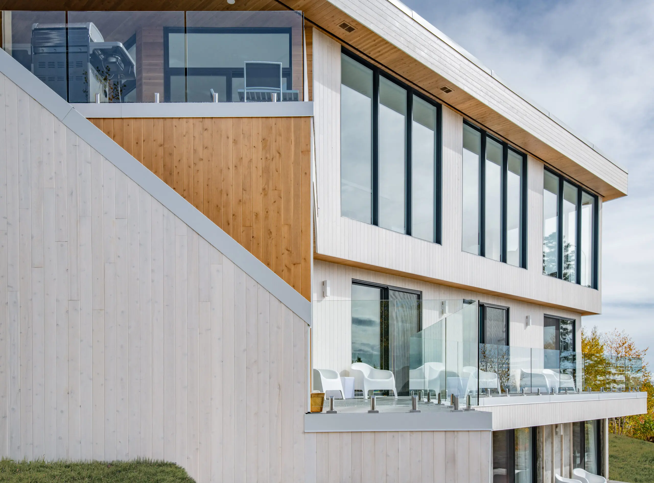 La Résidence s'inscrit dans un contexte dominé par le fleuve et met à profit le contact panoramique avec ce dernier. Située sur un flanc boisé de Charlevoix, la Résidence prend forme par deux volumes qui s'entrecroisent, dans le but de créer une invitation au visiteur. En effet, la percée visuelle résultante, perceptible dès la rue, contraste avec le reste de la façade. À l'intérieur, le visiteur peut apprécier les espaces communs à aire ouverte, qui se tournent vers le St-Laurent.