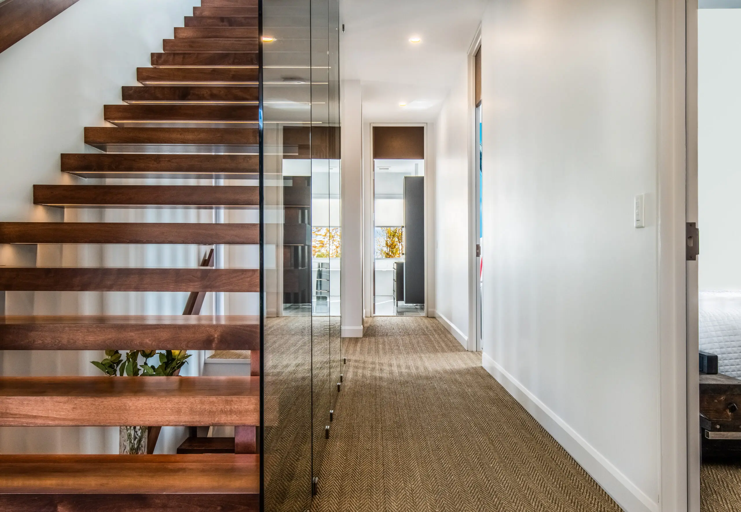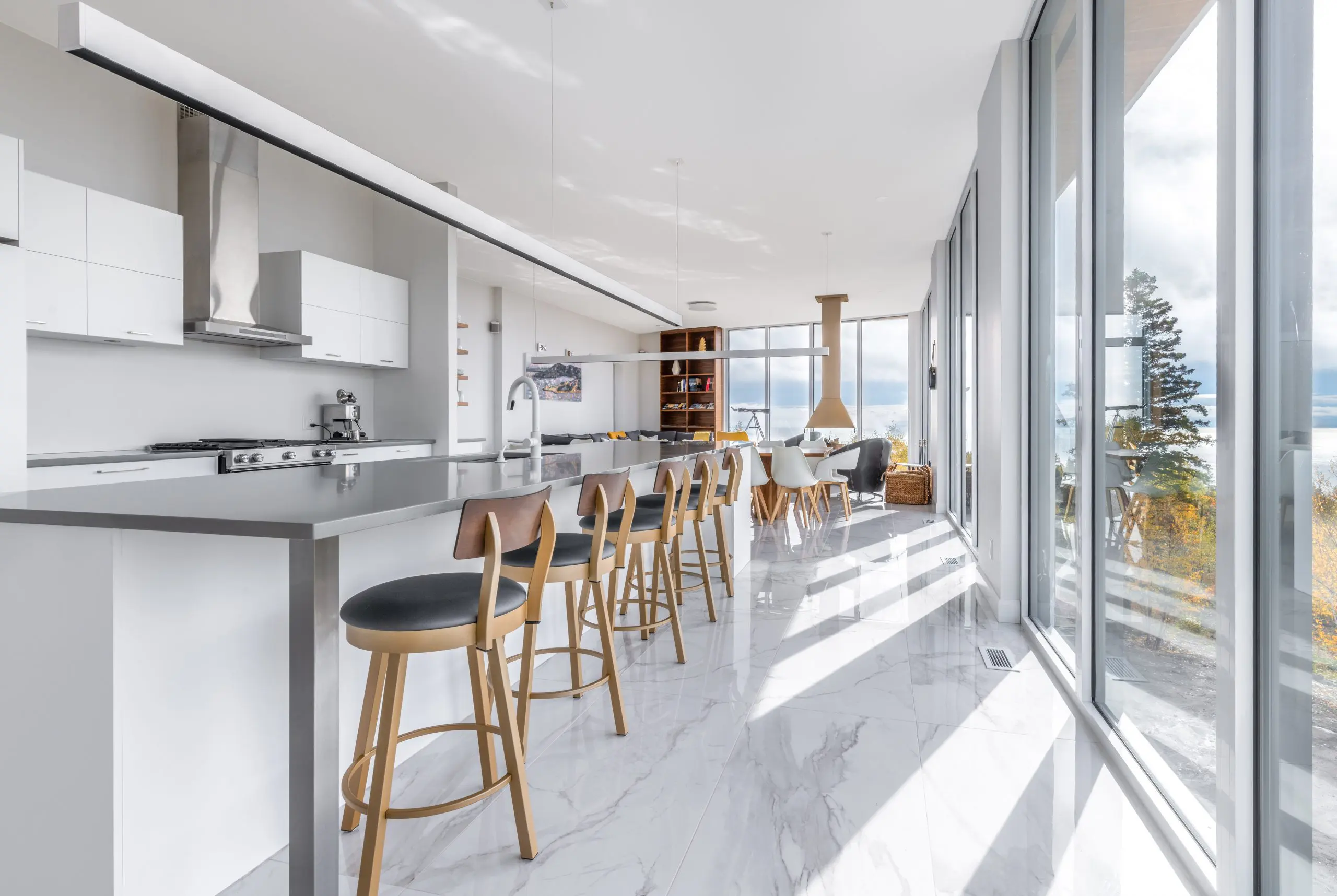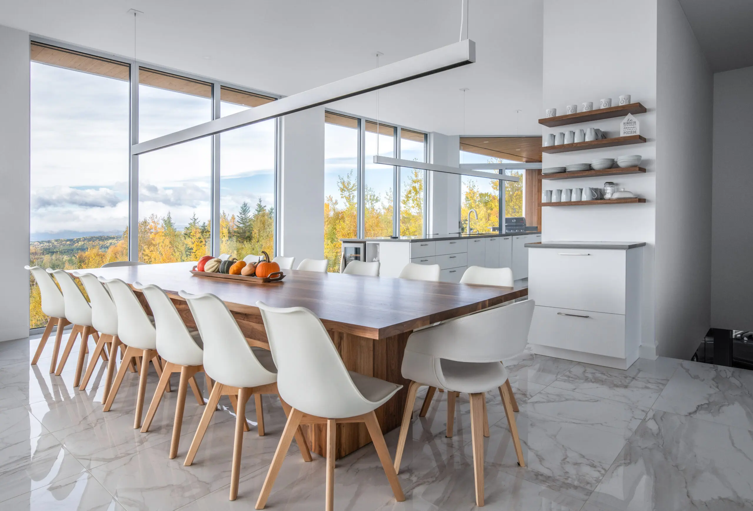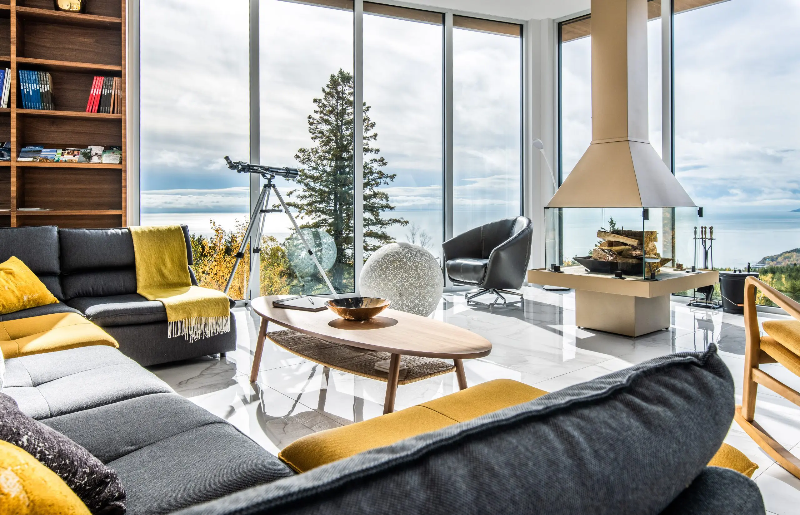 La Résidence s'inscrit dans un contexte dominé par le fleuve et met à profit le contact panoramique avec ce dernier. Située sur un flanc boisé de Charlevoix, la Résidence prend forme par deux volumes qui s'entrecroisent, dans le but de créer une invitation au visiteur. En effet, la percée visuelle résultante, perceptible dès la rue, contraste avec le reste de la façade. À l'intérieur, le visiteur peut apprécier les espaces communs à aire ouverte, qui se tournent vers le St-Laurent.